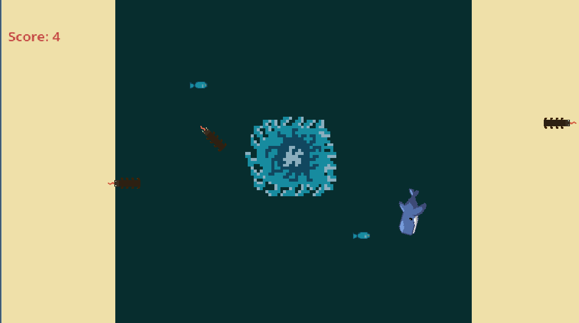 A typhoon struck in the middle of the ocean but that doesn't bother you, a strong and mighty whale, but it does bother someone else - Sea Worms. These ferocious beasts home is being destroys and are running at all costs but if the run into you, they will slice at you and you wounds will DISTROY YOU. AT ALL COST AVOID THEM! Of course there in the way of you hunting trip and your ECHOlocation show that the fish are right there and look VERY tasty and you want to eat them? Yeah you LOVE food, a little too much, anyway- GOOD LUCK!